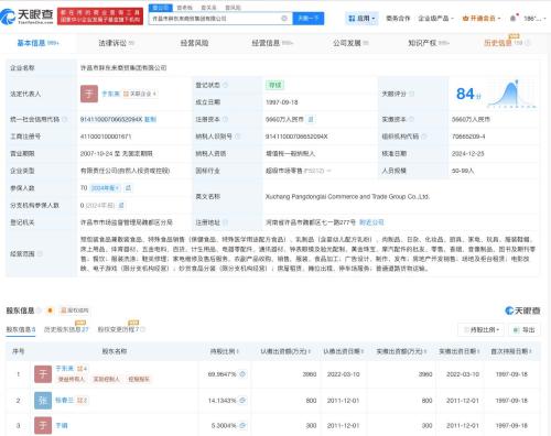 天眼查App显示,胖东来关联企业许昌市胖东来商贸集团有限公司成立于1997年9月,法定代表人为于东来,注册资本5660万人民币,经营范围包括预包装食品兼散装食品、特殊食品销售、餐饮等,于东来持有公司约70%股份,为第一大股东及实控人。