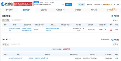 天眼查法律诉讼信息显示,近日,深圳华中科新材料技术有限公司及其法定代表人雷子荣新增一则限制消费令,涉及服务合同纠纷案件,执行法院为金华市金东区人民法院,此前,该公司已因此案被执行168万余元。
