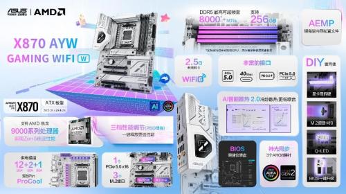 华硕X870 AYW GAMING WIFI W主板采用12+2+1供电模组(80A),搭配双8Pin ProCool高强度供电接口和8层PCB,可全面满足锐龙9000系列处理器在极限性能下的严苛要求。AI智能散热2.0可实时优化调节风扇转速,更加冷静散热!通过AMD EXPO和AEMP,内存频率至高支持DDR5 8000+(OC)。板载3个M.2接口,其中1个支持PCIe 5.0,均配备高效散热片,可有效降低温度。同样板载双USB4接口,提供40 Gbps高速传输。前置USB Type-C接口传输速度高达20 Gbps,且支持30W PD 3.0快充。板载2.5Gb有线网卡,并支持WiFi 6,高速传输,极低延迟。还有显卡易拆键、M.2便捷卡扣、BIOS便捷仪表盘、Q-LED故障诊断灯等,多方位提升DIY装机便利性。支持AURA SYNC神光同步,并板载3个第二代可编程ARGB灯效接针,可搭配兼容设备,轻松实现光效联动,打造一体化整机灯效。