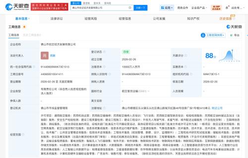 天眼查App显示,近日,佛山市低空经济发展有限公司成立,法定代表人为周敏,注册资本1亿人民币,经营范围含通用航空服务、民用机场运营、民用航空器维修、民用航空维修人员培训、飞行训练、民用航空器驾驶员培训、检验检测服务、民用航空油料储运及加注服务、互联网信息服务等,由佛山市交通投资集团有限公司全资持股。