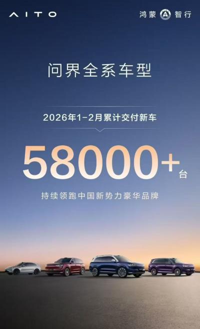 鸿蒙智行问界全系车型1-2月累计交付新车超5.8万。