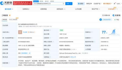 天眼查App显示,四川省蜀福香食品有限责任公司成立于1997年12月,法定代表人为王立群,注册资本2380万人民币,经营范围包括食品生产、食品销售、餐饮服务等,由成都市众兴食品有限公司、四川省荣盛泰集团有限责任公司共同持股。经营信息显示,已获得质量管理体系认证。