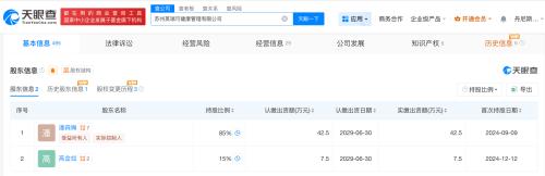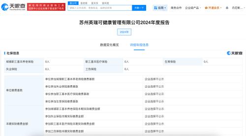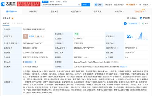 天眼查App显示,苏州英瑞可健康管理有限公司成立于2024年9月,法定代表人为潘森娒,注册资本50万人民币,经营范围包括食品销售、远程健康管理服务、健康咨询服务、体育健康服务、护理机构服务等,由潘森娒、高金如共同持股。2024年年报信息显示,该公司参保人数为0。