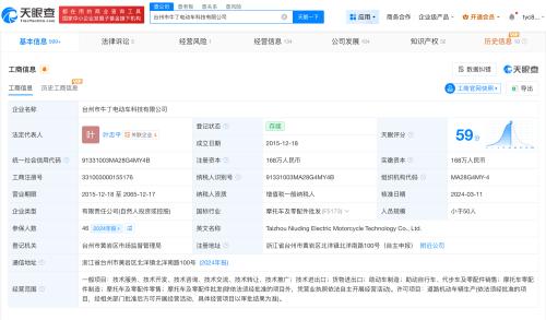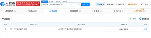 天眼查App显示,台州市牛丁电动车科技有限公司成立于2015年12月,法定代表人为叶忠平,注册资本168万人民币,经营范围包括货物进出口、助动车制造、摩托车零配件制造等,由叶忠平、王文庆、陈连胜、刘起武共同持股。经营风险信息显示,此前,该公司曾召回部分牛丁牌电动自行车,召回原因涉及整车质量、蓄电池防篡改项目不符合标准要求,消费者在使用时存在可能引起交通事故和火灾的风险。法律诉讼信息显示,该公司曾涉及财产损害赔偿纠纷、买卖合同纠纷。对外投资信息显示,去年6月,该公司成立了台州市牛丁进出口有限公司。分支机构信息显示,今年1月,该公司成立了台州市牛丁电动车科技有限公司头陀分公司。