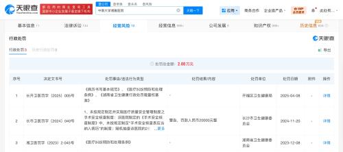 天眼查工商信息显示,中南大学湘雅医院法定代表人为雷光华,开办资金约6.8亿人民币,宗旨和业务范围包括为人民身体健康提供医疗与护理保健服务等。天眼风险信息显示,2025年4月,该医院曾因违反《病历书写基本规范》、《医疗纠纷预防和处理条例》、《湖南省卫生健康行政处罚裁量权基准》 ,被开福区卫生健康局罚款3万元;2024年11月、2023年12月,该医院曾因违反《医疗纠纷预防和处理条例》被罚。此外,该医院现存多条法律诉讼信息,案由涉及医疗损害责任纠纷、医疗服务合同纠纷、侵权责任纠纷等。