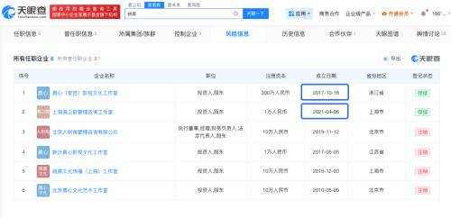 天眼查App显示,姚晨名下晨心(安吉)影视文化工作室与曹郁名下探照灯(安吉)影视文化工作室均于2017年10月16日注册成立,注册资本均为300万人民币;姚晨名下上海海之歌管理咨询工作室与曹郁名下上海圆舞曲管理咨询工作室均于2021年4月6日注册成立,注册资本均为1万人民币。目前,上述四家工作室均为存续状态。