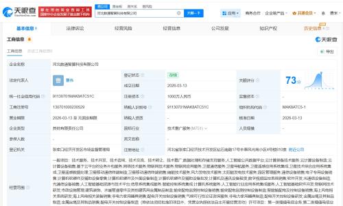 天眼查App显示,近日,河北数通智算科技有限公司成立,法定代表人为曹伟,注册资本1000万人民币,经营范围包括数据处理和存储支持服务、人工智能公共数据平台、云计算装备技术服务等。股东信息显示,该公司由河北骐通科技有限公司、软通动力(301236)旗下软通智算科技(广东)集团有限公司共同持股。
