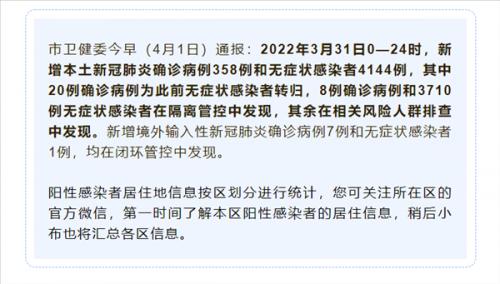 截至2022年3月31日24时,上海市累计本土确诊1937例,治愈出院590例,在院治疗1340例,死亡7例。现有待排查的疑似病例0例。尚在医学观察中的本土无症状感染者32648例。