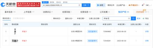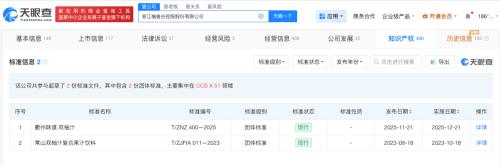 知识产权信息显示,该公司已申请注册多个“宋柚”“汉柚”等商标,国际分类涉及运输工具、医药、广告销售等,商标状态多为已注册。值得注意的是,该公司注册的“宋柚汁”商标均已被驳回。标准信息显示,该公司曾参与起草“衢州味道双柚汁”等团体标准文件,目前上述标准状态均为现行。