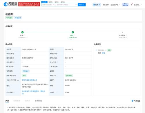 天眼查知识产权信息显示,近日,宇树科技股份有限公司申请的"机器狗"外观专利获授权。摘要显示,本外观设计产品用于服务、搜救、陪护、巡检、教育、导航、摄像、玩具、智能交互、娱乐互动、执行...