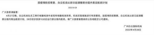 通报显示,4月27日晚,白云机场在员工例行核酸检测中发现有核酸检测异常,目前机场采取措施进行有效管控。请广大旅客留意政府公告或航空公司通知。