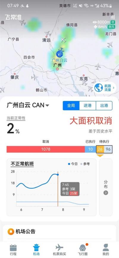 今天上午10时30分,记者通过飞常准APP查询了解到,今天成都双流飞广州白云计划航班为17个,已有14个航班的状态显示“取消”或“提前取消”。