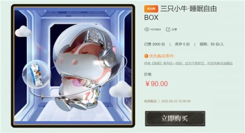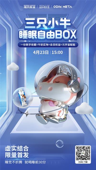 4月23日,三只小牛联合ODin META元宇宙平台,发售首款NFT数字藏品「睡眠自由BOX」,获超百万人关注,限量2000份开售10分钟被抢售一空,受到“元宇宙居民”热捧。这是三只小牛首次为功能牛奶注入虚实交互创新,为消费者在饮奶自由探索出了一种实体牛奶+NFT数字藏品+私域引流闭环的创新模式,坚持给大家带来健康好奶,号召大家关注品质生活。