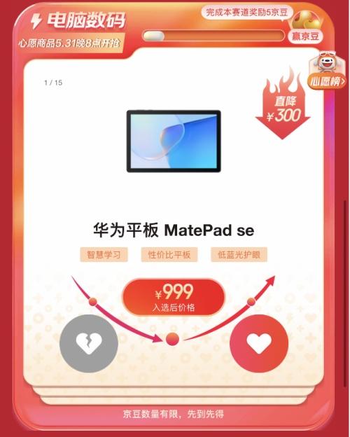 对于现在的年轻人来说,平板电脑、笔记本、智能手表、路由器、显卡等电脑数码产品既是生产力工具,又是娱乐健身等场景的关键装备,可以说无论是工作还是生活都离不开。截至目前,在京东电器巨超值专区上榜电脑数码“实时用户心愿排名”前15的平板电脑,属华为平板MatePad SE最受关注。该产品搭载HarmonyOS 2,带来的智慧桌面,通过科学的功能分区模块,使布局更加清晰简洁,无论是家庭成员的娱乐需求,还是学习需求,均可得到满足。如果最终入选的话,将直降300元,京东一口价999元。