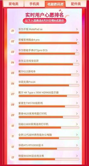 此外,上榜电脑数码“实时用户心愿排名”前15、在巨超值活动专区内较热门的心选产品还有爱普生TW5700投影仪、惠普4825家用喷墨打印机、华硕ATS RTX3050显卡、荣耀家用路由4 Pro、戴尔4K Type-C HDR400显示器、华硕TUF B660M-PLUS D4主板等,如果最终它们入选榜单前30名,都将在5月31日晚8点正式开抢并以“一口价”形式让利消费者。