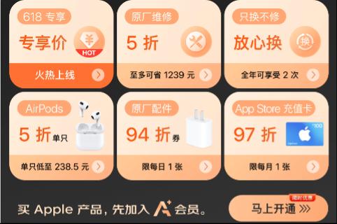 618启动前,京东将Apple产品自营店尊享会员升级为京东Apple产品自营店A+会员,为消费者带来618惊喜好价。更有屏幕换新5折、电池换新5折、AirPods单只5折、原厂配件94折券等权益和保障。京享值≥6000就有机会以99元开通,解锁原价1999元的会员权益,京享值<6000的消费者可以查看官方给出的京享值加分攻略,加速解锁超值A+会员。
