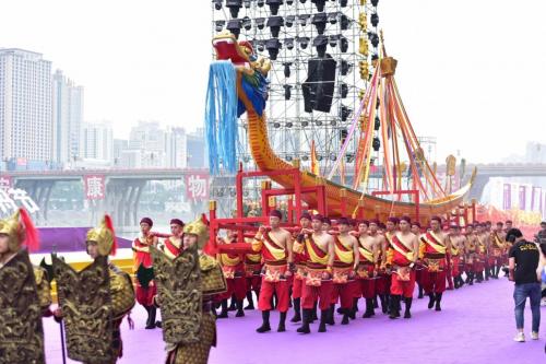 开幕式上举行了“缅怀先贤”“龙头点睛”“龙舟展示”“民歌民舞”“民俗表演”“汉江横渡”“抢鸭子摸鲤鱼”等节目。伴随着低沉雄厚的嘿嘿声响起,船身缓缓走向舞台,十八名壮汉抬起龙头相向而行……龙头祭祀,是安康龙舟风俗中一项重要的传统仪式,寄托着万千百姓祈福风调雨顺、祈福万家平安的美好心愿。