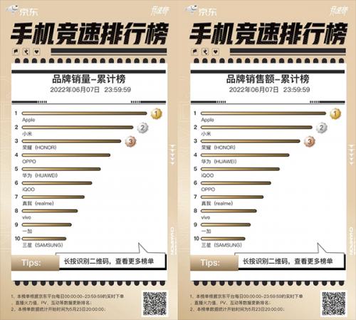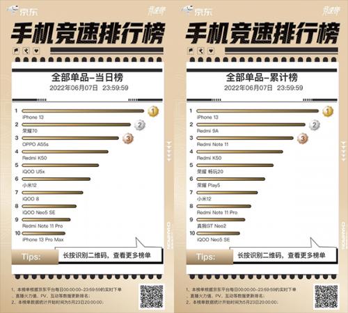 截至6月7日24点,iPhone 13凭借强悍的性能以及京东618超值福利,已经连续6天霸榜京东手机单品当日榜以及累计榜冠军。在IMX800、天玑9000的加持下,荣耀70拿下了京东手机单品当日榜亚军,OPPO A55S、Redmi K50、iQOO U5x紧跟随后,小米12、iQOO 8、iQOO Neo5 SE、Redmi Note 11 Pro、iPhone 13 Pro Max分列第6到第10位。手机单品累计榜方面,Redmi 9A、Redmi Note 11、Redmi K50、荣耀畅玩20占据了前5,Redmi独占3席。