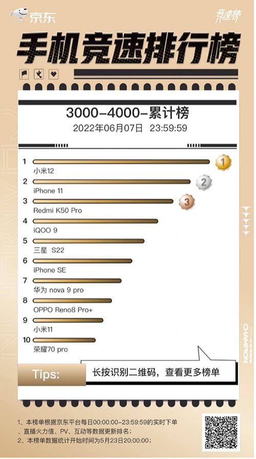 备受消费者关注的3000-4000元累计榜方面,最受欢迎的产品为小米12,拿下了累计榜冠军,排在第2至第5位的分别为iPhone 11、Redmi K50 Pro、iQOO 9、三星S22。与此同时,iPhone SE、华为nova 9 Pro、OPPO Reno8 Pro+、小米11、荣耀70 Pro也跻身累计榜TOP10。