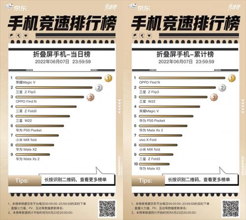 随着折叠屏手机走向大众市场,今年618京东也推出了折叠屏手机排行榜,荣耀Magic V、三星Z Flip3、OPPO Find N拿下了6月7日当日榜单前3位置。排在累计榜前3的分别为OPPO Find N、三星Z Flip3、三星W22。其中,OPPO Find N采用内折叠设计,创新精工拟椎式铰链,搭载骁龙888处理器,配备内外双前置3200W摄像头,支持33W无线快充,性价比极高,满足了消费者办公、娱乐等不同方面的需求,618期间,限时直降310元,到手价7389元,支持6期免息,享180天只换不修服务,想要入手折叠屏手机的可以考虑一下。