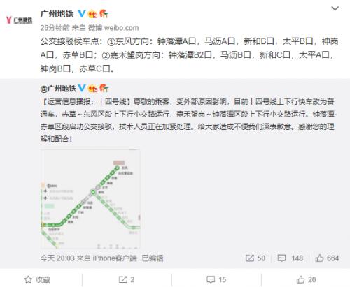@广州地铁发布消息称,受外部原因影响,目前十四号线上下行快车改为普通车,赤草-东风区段上下行小交路运行,嘉禾望岗-钟落潭区段上下行小交路运行。钟落潭-赤草区段启动公交接驳,技术人员正在加紧处理。
