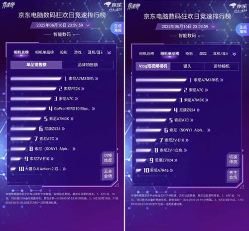 相机方面,截至6月16日23:59,索尼A7M3单机、索尼FE24、索尼A7C位居相机总榜单品销售额榜TOP3;而在相机单品榜中,位居Vlog短视频相机前三的同样是索尼旗下的产品,分别为索尼A7M3单机、索尼A7C、索尼A7M3K。