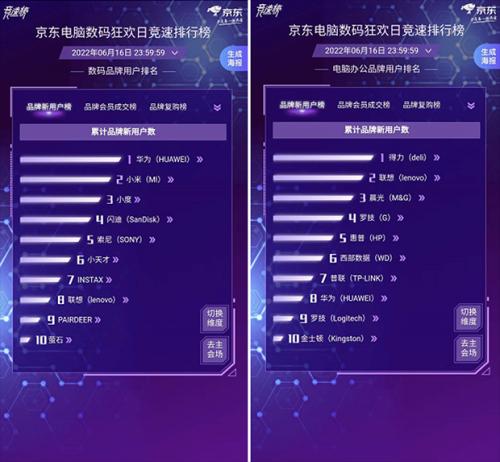 数码品牌用户排名及电脑办公品牌用户排名方面,截至6月16日23:59,华为位居数码品牌用户排名累计品牌新用户数冠军,得力则位居电脑办公用户排名累计品牌新用户数冠军。