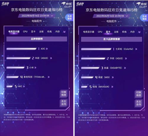 想要在京东618终极秒杀活动低价攒一台高配电竞“怪兽”,可以关注下电脑配件榜单。截至6月16日23:59,AOC位居电竞显示器品牌销额榜榜首,华硕、小米位列其后。显卡方面,七彩虹品牌斩获了该品类品牌销售额冠军,华硕、技嘉等品牌则分列第二、第三位。