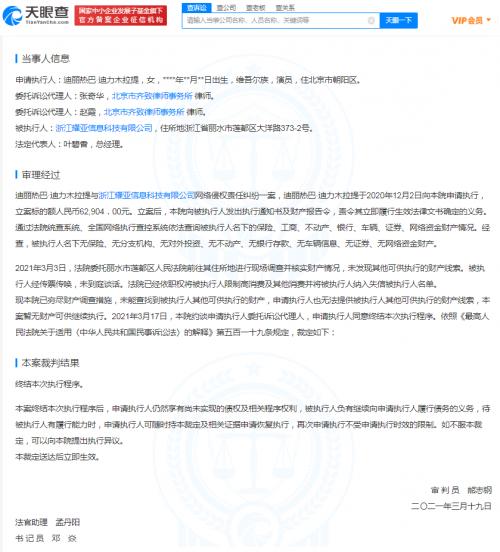 天眼查App显示,近日,迪丽热巴*迪力木拉(下称迪丽热巴)等执行裁定书公开。该裁定书显示,迪丽热巴因与浙江耀亚信息科技有限公司网络侵权责任纠纷一案,向法院申请申请执行耀亚科技立案标的额人民币62904元,现因被执行人暂无财产可供继续执行,法院终结本次执行程序。