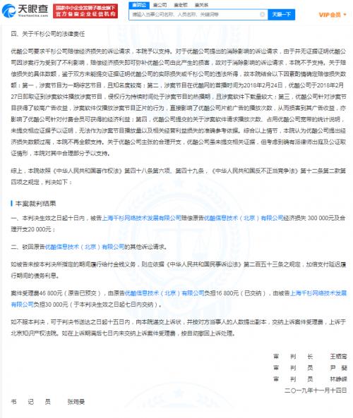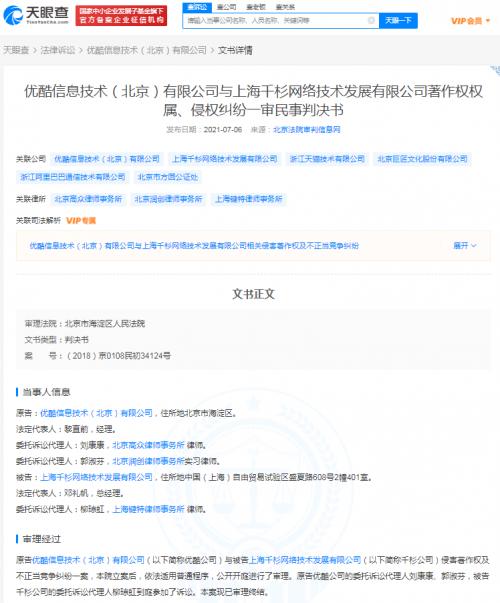 天眼查App显示,7月6日,优酷信息技术(北京)有限公司与上海千杉网络技术发展有限公司著作权权属、侵权纠纷一审民事判决书公开,案号(2018)京0108民初34124号,审理法院为北京市海淀区人民法院。