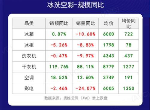 不难发现,整个家电市场35个品类中,销量同比增长的仅7个品类,销额同比增长的仅8个品类,也就是说整个线下市场的表现非常难。同时,由于上游原材料价格不断上涨,我们看到线下市场家电产品均价都出现了大幅上涨,最高彩电上涨达到1350元,涨幅巨大。