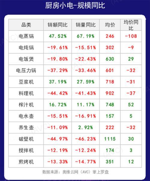 厨房小家电方面,电蒸锅、豆浆机、榨汁机销量、销额同比增长之外,其他的电饭锅、电压力锅、养生壶、破壁机等厨房小家电产品销量、销额都是负增长。这一表现与去年小家电市场的表现截然不同,小家电市场增长也出现了难以维继的表现。