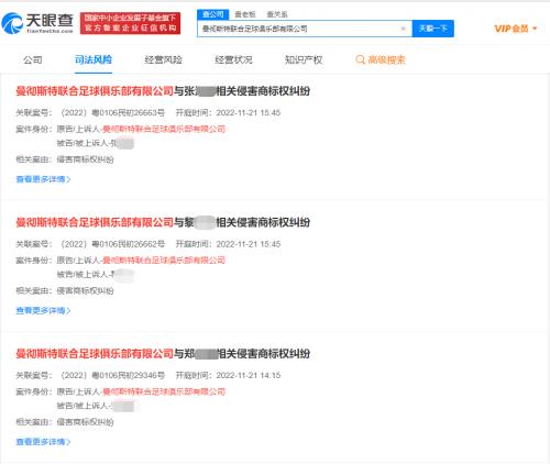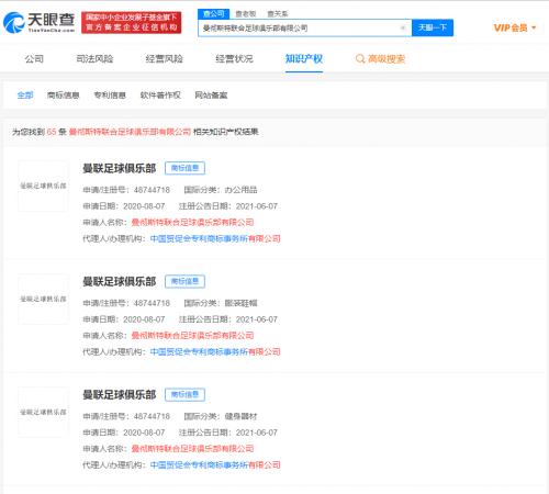 天眼查App显示,近期,曼彻斯特联合足球俱乐部有限公司作为原告的多起侵害商标权纠纷案开庭,被告包括多名自然人及电商公司、贸易公司等。目前,曼彻斯特联合足球俱乐部有限公司通过代理公司共申请了65枚商标,其中50余枚已完成注册,包括“MANCHESTER UNITED ”“曼联足球俱乐部““曼联”等,国际分类包括服装鞋帽、健身器材、办公用品等。