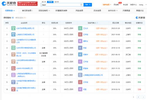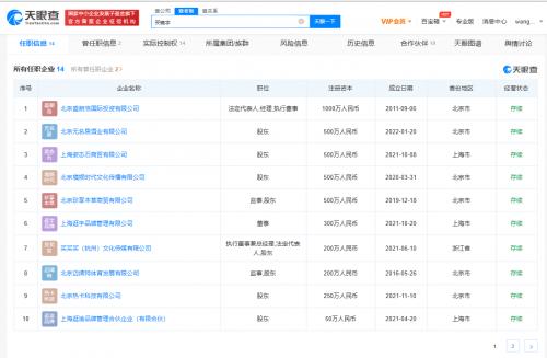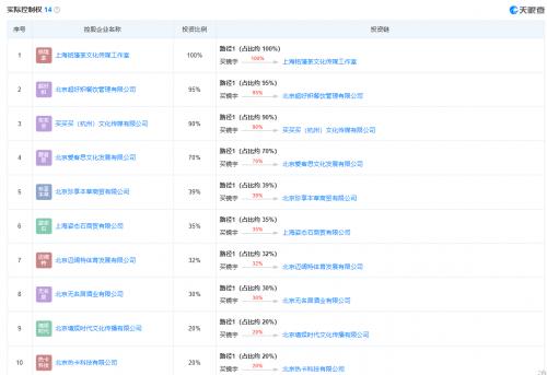 天眼查App显示,目前,买超(本名买镜宇)关联的14家企业中11家为存续状态,包括北京盛朗浩国际投资有限公司、北京无名居酒业有限公司、上海姿态石商贸有限公司等,涉及体育、传媒、餐饮、商贸等领域。在上述存续状态的企业中,买超在2家企业中担任法定代表人,在6家企业中担任高管,并在9家公司中持有股份。通过直接或间接持股,买超拥有14家企业的实际控制权。