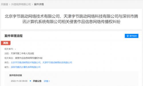 天眼查App显示,近日,北京字节跳动网络技术有限公司、天津字节跳动网络科技有限公司与深圳市腾讯计算机系统有限公司相关侵害作品信息网络传播权纠纷案件新增开庭公告,原告为抖音集团旗下两公司,被告为深圳市腾讯计算机系统有限公司,该案将于11月30日在天津市第三中级人民法院开庭。