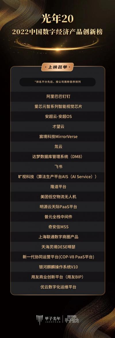 此外,“2022中国数字经济产品创新榜”旨在表彰2022年度中国数字经济领域内的创新性产品,国产操作系统领域银河麒麟操作系统V10以及阿里巴巴钉钉、飞书、达梦数据库管理系统(DM8)、奇安信MSS、用友商业创新平台(用友BIP)等软硬件行业领先产品共同上榜。