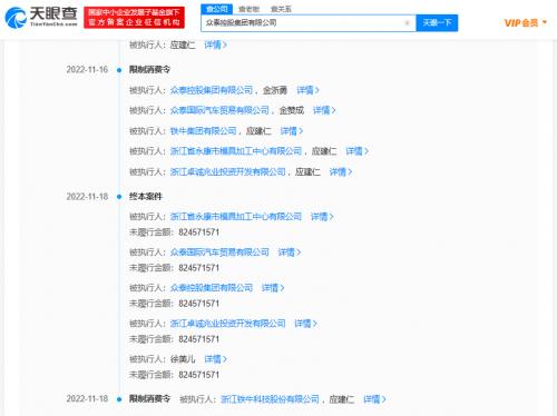 天眼查App显示,近日,众泰控股集团有限公司、众泰国际汽车贸易有限公司等新增终本案件信息,执行标的约9.03亿元,未履行金额超8.24亿元,关联案件为中国信达资产管理股份有限公司浙江省分公司与上述公司的相关借款合同纠纷。