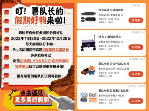 在度假的路上,你或许会收获漂亮的风景、美丽的心情。除此之外,小红书和领克还想为大家带来一份特别的假期惊喜。即日起在小红书搜索话题词#假期遇见薯队长进入活动页面,完成指定任务获取相应积分,即有机会解锁领克车顶行李箱套装、领克露营车、领克02车模,以及薯队长联名周边等丰厚大礼。