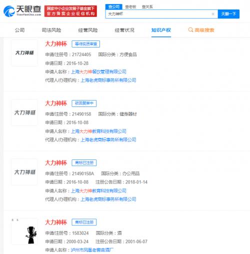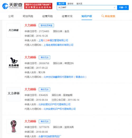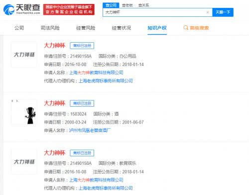 天眼查App显示,全国现有近20条“大力神杯”商标申请信息,申请人包括餐饮管理公司、药业公司、教育科技公司、酒厂等及多名自然人,国际分类涉及教育娱乐、啤酒饮料、厨房洁具等,最早申请于2000年。其中,已有多枚“大力神杯”商标完成注册,其余商标状态或流程则显示为无效、驳回复审。