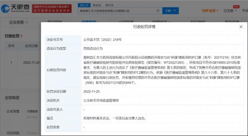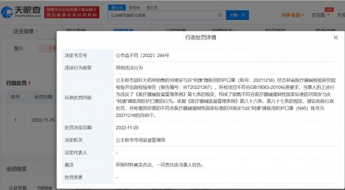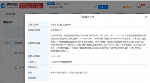 天眼查App显示,近日,因销售不符合医疗器械强制性国家标准的医用防护口罩,公主岭市龙翔大药房、公主岭市益轩大药房、公主岭市龙城药店、梨树县汇丰大药房连锁有限公司市医院分店被当地市场监督管理局处罚。