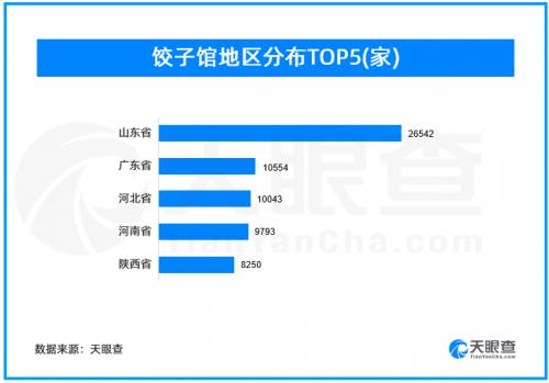 从地区分布上看,山东有超2.6万家饺子馆相关企业,占总数约18.6%,位居全国首位;广东省、河北省均有超1万家,位居第二、第三;河南、陕西分别拥有9700余家、8200余家,分列第四、第五位。