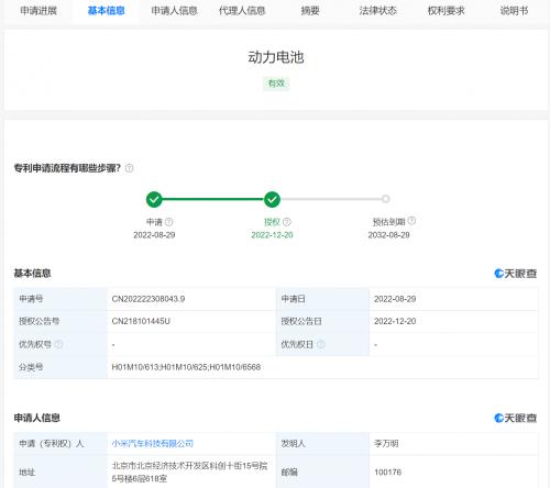 天眼查App显示,近日,小米汽车科技有限公司“动力电池”专利获授权。