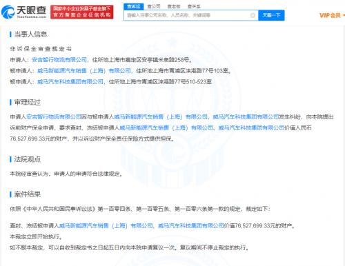 天眼查App显示,近日,安吉智行物流有限公司与威马新能源汽车销售(上海)有限公司、威马汽车科技集团有限公司非诉保全审查裁定书公开。文书显示,申请人安吉智行物流公司请求法院查封、冻结被申请人威马两公司价值7652万元的财产。法院认为,安吉智行物流公司的申请符合法律规定,裁定执行。
