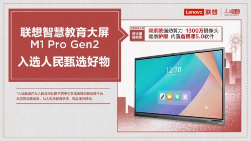 DoNews12月26日消息,近日,联想智慧教育大屏M1 Pro Gen2作为推动民族教育事业发展的优质产品,成功入选“人民甄选匠心品质”好物名单。据悉,人民甄选是人民日报旗下人民创意建立的好物推荐平台,人民创意作为专注文化创意领域的跨界整合平台,以满足人民美好生活为导向,坚持守正创新、讲好中国故事,为不断发现优质民族品牌、推动中国品牌创新发展贡献力量。