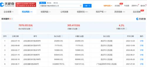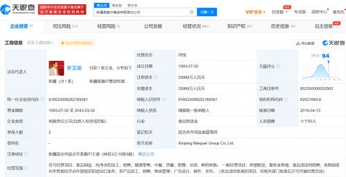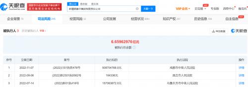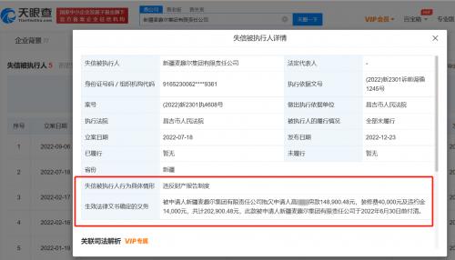 天眼查App显示,近日,新疆麦趣尔集团有限责任公司因违反财产报告制度,被昌吉市人民法院列为失信被执行人(老赖),关联案件为装修纠纷,履行情况为全部未履行。该案于今年7月被强制执行,执行标的20.29万元。今年10月,该公司及法定代表人李玉瑚因该案被限制高消费。