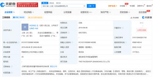天眼查App显示,近日,菲诗小铺(上海)化妆品销售有限公司经营状态由存续变更为注销,注销原因为公司合并或分立。该公司成立于2010年8月,法定代表人为HONG SUNG HA,注册资本500万美元,经营范围包括化妆品、化工产品(危险品除外)、化妆品用调味品、香料、日用百货、食品的批发、零售等,由LG生活健康股份有限公司全资持股。