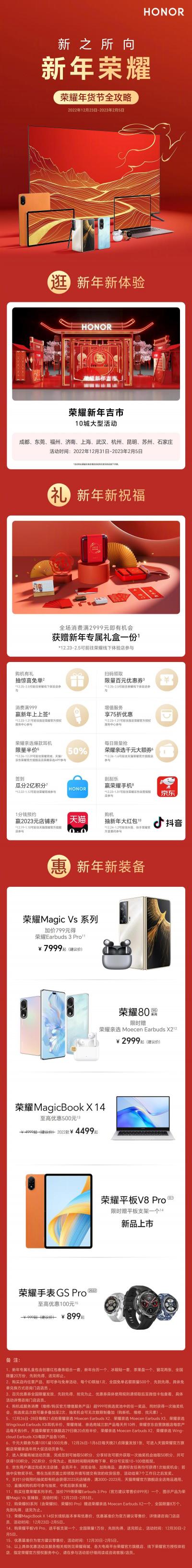 2022年12月26日,荣耀全场景新品发布会举行,推出了全新旗舰荣耀平板V8 Pro,以及全新荣耀80 GT手机,为消费者在年末选购新机又带来更多选择。同时在新一年即将来临之际,荣耀也在此次发布会上正式宣布2023年货节启动。节日气氛悄然而至,荣耀2023年货节也将准备多场“荣耀新年吉市”大型主题活动及优惠好礼,为消费者送上新年的祝福和惊喜。