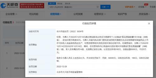 处罚详情显示,当事人从邢某某个人处购进“连花清瘟胶囊”共100盒,进货价格为每盒50元。当事人不能向执法部门提供进货的相关票据,且无法证明邢某某具备药品上市许可持有人或者具有药品生产、经营资格等相关资质及相关身份证明文件。经查,2022年12月14日至12月16日期间,当事人在经营场所内以每盒65元的价格对外销售该“连花清瘟胶囊”3盒,家人及亲属自用14盒,无销售记录及台账;认定违法所得195元,货值金额5000元。