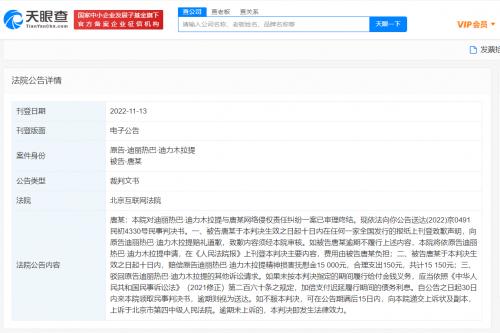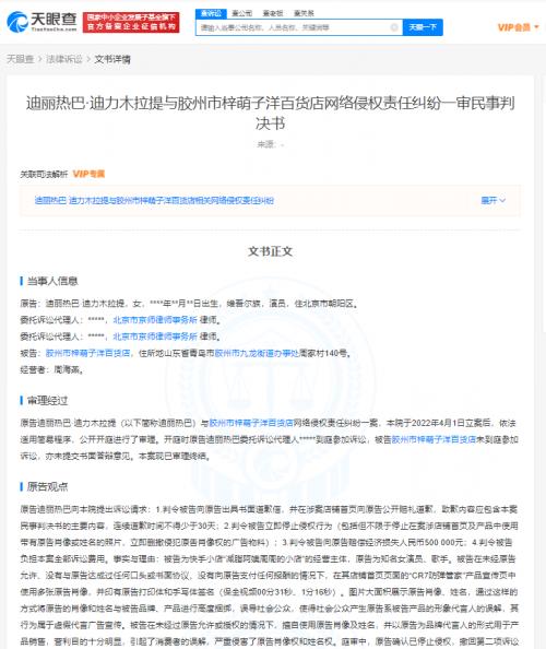天眼查App显示,近期,多个迪丽热巴维权案件裁判文书公开,被告包括陕西千姿朵色贸易有限公司、胶州市梓萌子洋百货店、唐某、徐某某等,案由多为网络侵权责任纠纷,原告迪丽热巴获赔1.5万至8万元不等。