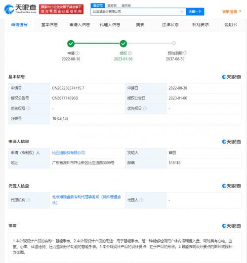 天眼查App显示,1月6日,比亚迪股份有限公司申请的“智能手表”专利获授权。